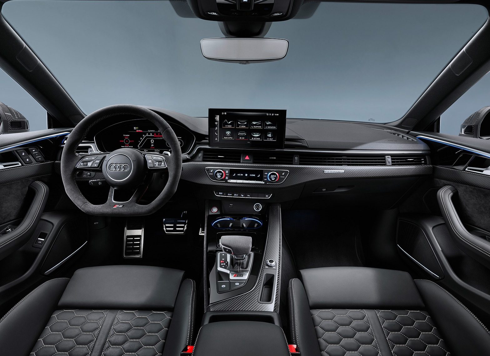 Inside, the previous MMI infotainment system has been replaced by the new freestanding 10.1-inch display with RS specific graphics, while the 12.3-inch Virtual Cockpit Display, also with bespoke readouts, can be had from the options lists. Elsewhere, the red or grey stitched steering wheel now comes with the RS1 and RS2 mode buttons as part of the Drive Select system, while the RS Sport seats can optionally be trimmed in fine Nappa leather as opposed to the standard leather/Alcantara. A further option is the RS Design Package that sees various trim pieces boasting red or grey detailing.